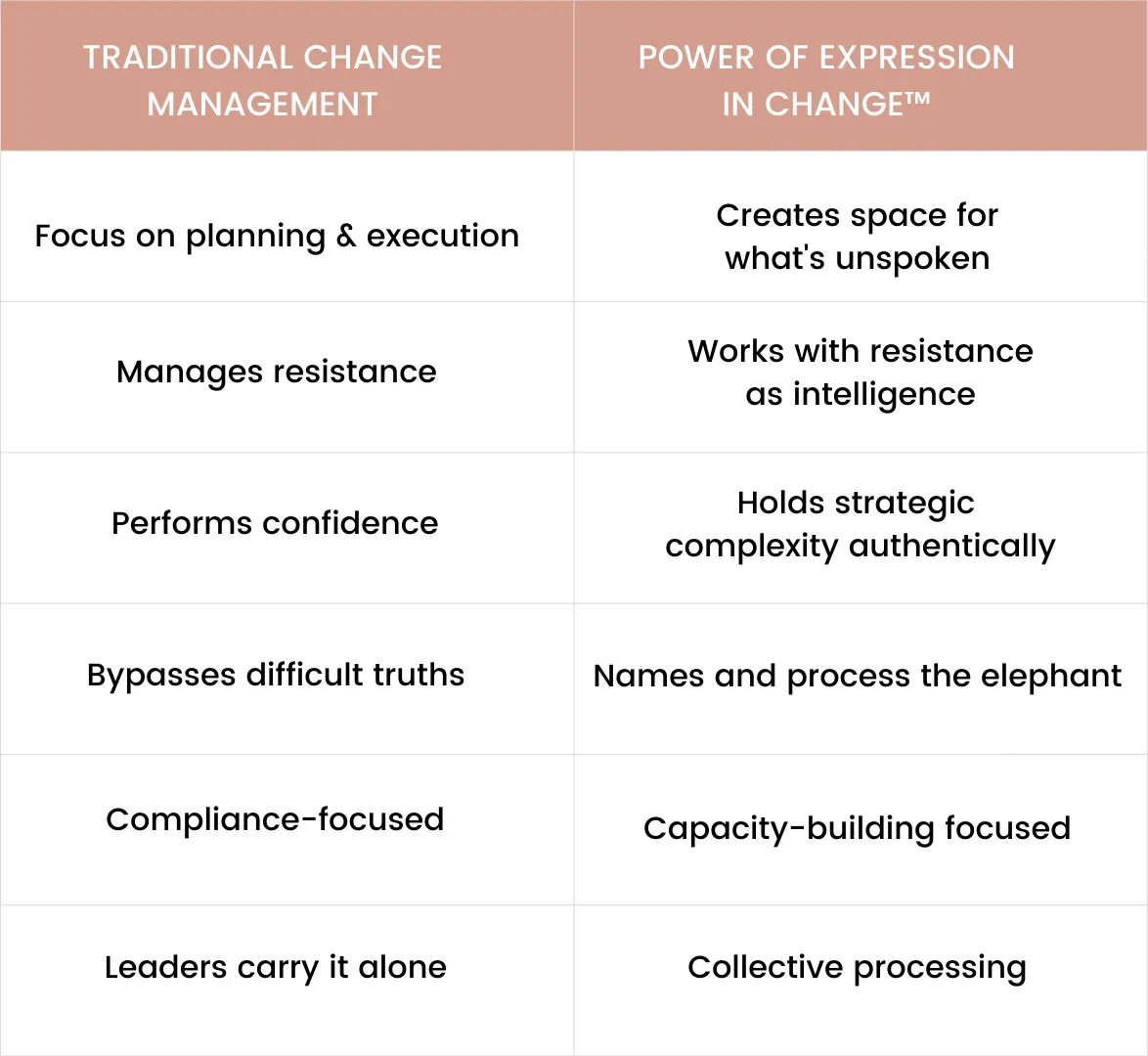 Power of Expression in Change™ creates structured space where the unspoken can be worked with, so transformation can address what's actually real.